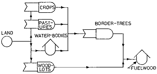 Such an ecosystem diagram helps to reveal clearly the complex inter-relationships between human beings, livestock, land, energy and water, and water, and between food, fuel, fodder and fertilizer. But the inclusion of the Ungra ecosystem diagram in the present paper would divert attention to a great deal of information directly relevant to a discussion of wood resources. In addition, it would the detailed description of a specific village with all its peculiar features, for instance the absence of fuel exports. Nevertheless, the understanding derived from the Ungra ecosystem is useful in evolving a simplified generalized diagram which can then be used to discuss the role of wood in typical village agricultural ecosystems. The procedure will consist of considering all the ecosystem components and activities land, water, nutrients, inanimate and animal, energy, fodder, cooking, trees, building, etc.) one by one and discussing the interactions between fuelwood and each of these components or activities. This understanding of pair-wise interactions will, then be integrated into an ecosystem diagram which displays all the complex and varied inter-relationships involving fuelwood. What follows therefore is the step-by-step development of suck a diagram and a description of the ecosystem relationships involving wood.
