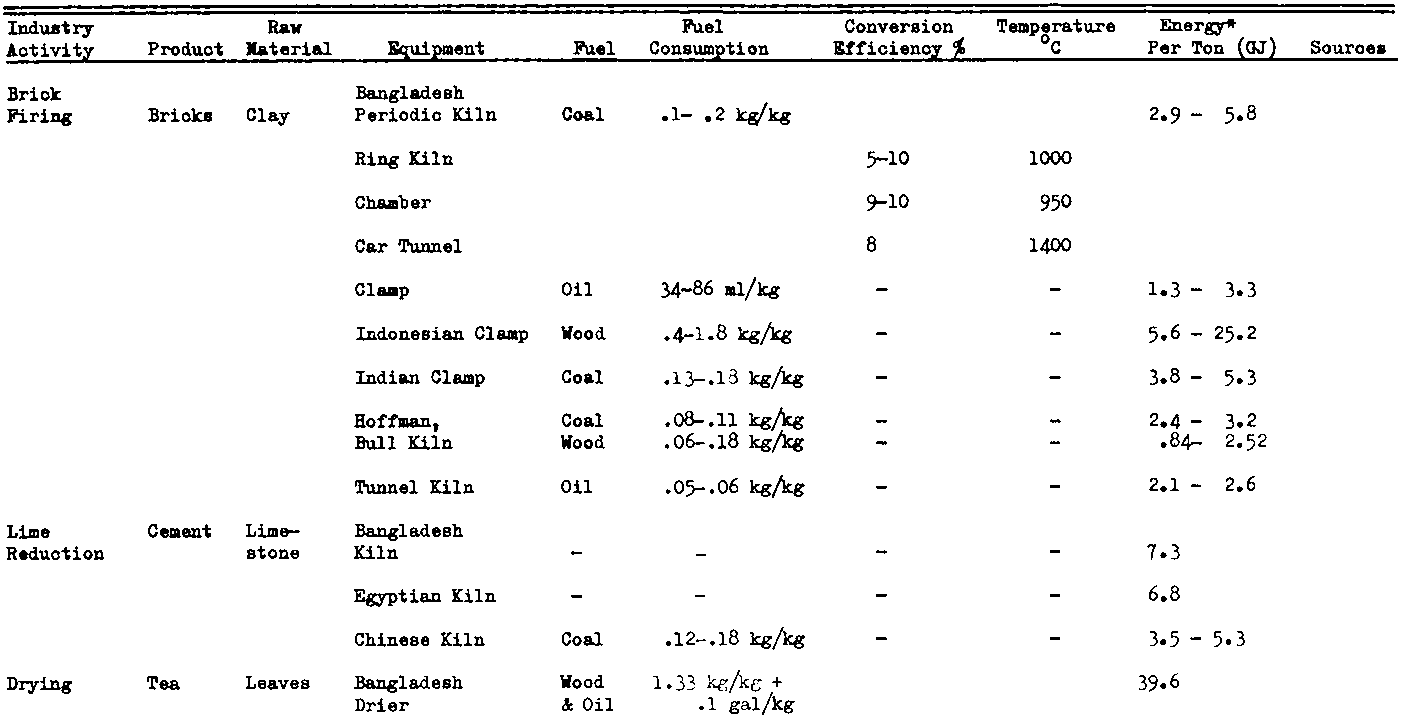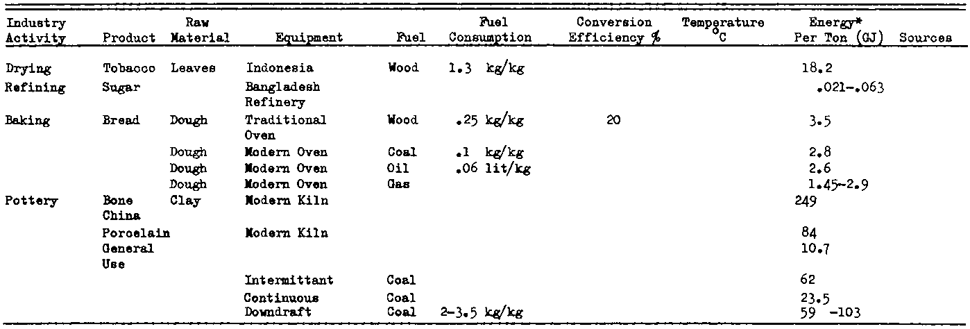 The small industries that are the primary consumers of fuels for heat generation are the brick and lime kilns, crop driers, blacksmith forges, commercial ovens and stoves, and pottery kilns. Fuels used include wood fuels, agricultural and forestry residues, coal, oil, and, in some oases, electricity, The fuel requirements vary over a wide range because of differences in the firing temperature, the thermal efficiency of the conversion unit, the physical characteristics of the raw materials and the type of product. An indication of the range of energy demand is shown in Table IV-3.