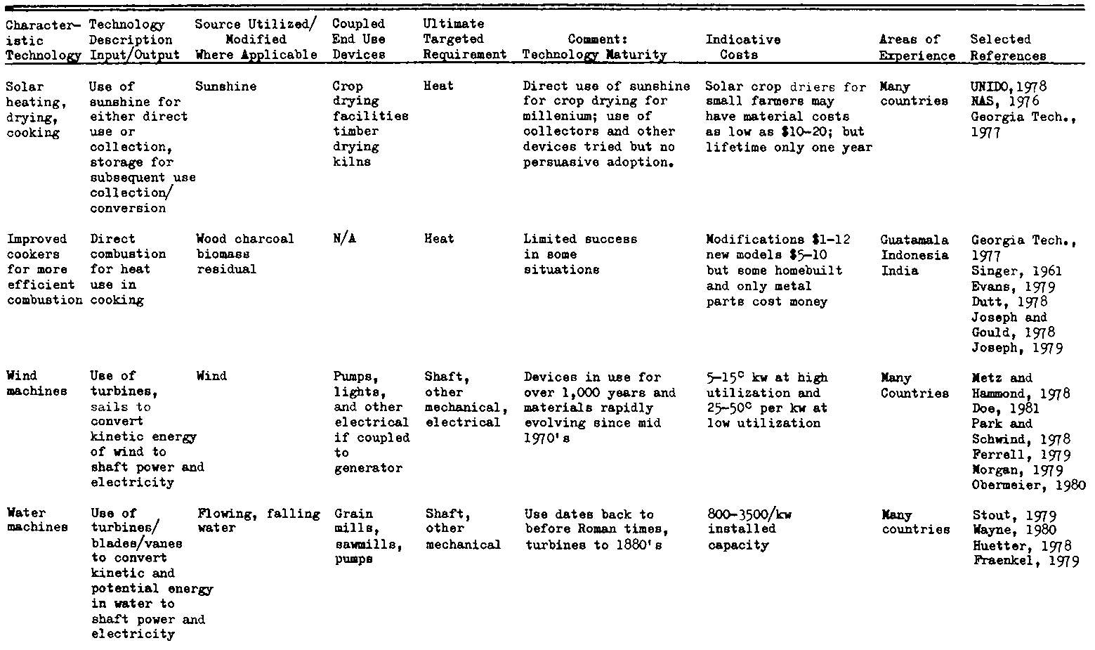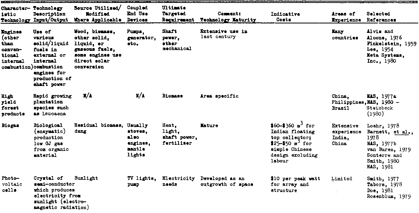Several conversion technologies using renewable energy sources are being developed which are both complementary to and competitive with fuelwood and charcoal in some of the applications discussed above. Information on the applicability of several old and new energy technologies in specific and uses is summarized in Table IV-4.