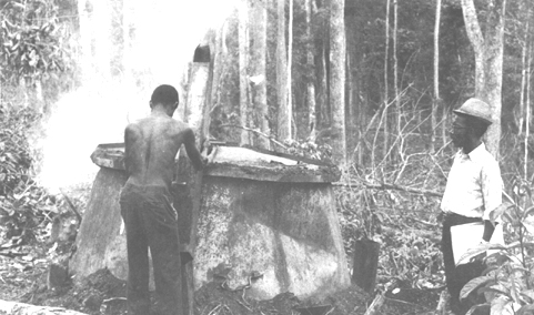 Charcoal burning on the Subri River Forest Reserve in Ghana. When the area was replanted for paper pulp fuelwood and charcoal were sold off, and agriculture encouraged between the rows of tree seedlings. Returns exceeded cost by several hundred dollars a hectare