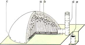 In Senegal, however, an FAO project has produced encouraging results from an appropriate technology charcoal technique, based on the earth pit. Known as the Casamance earth kiln (after the area in which it was first developed), it differs from the traditional technique in that the wood is stacked on a circular platform of logs and a metal chimney, consisting of three oil drums welded together, is provided. Yield is 24-36 per cent by weight, equivalent to about 50 per cent on an energy basis. Carbonization time is cut by two-thirds and the only cost is about $75 for the chimney.