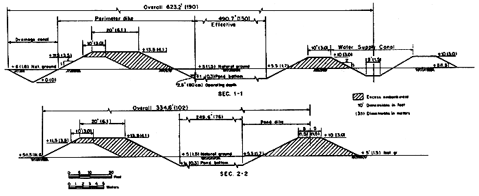 The tidal plan pond analysis was made by analyzing excavation and embankment needs of Pond No. 1, which has the highest average ground elevation of + 5 ft (1.5 m) to + 6 ft (1.8 m) and Pond No. 8, which has the lowest elevation of + 3 ft (0.9 m) to 4 ft (1.2 m). All of the ponds in the tidal study have a bottom elevation of + 1 ft (0.3 m), this having been established by actual construction and operation of the Research Station ponds as the highest practicable elevation for filling the pond during neap tides and also the lowest to obtain acceptable drainage.