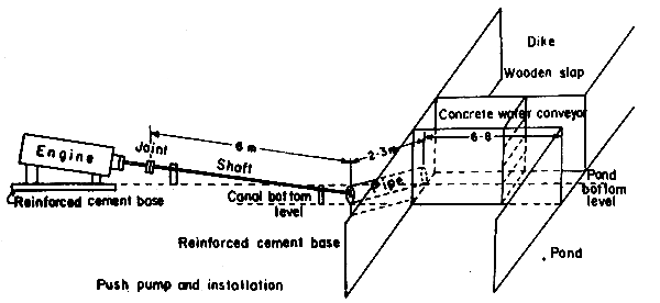 With the use of the pumps, the farmers realized a yield of about 1,875 to 2,500 kg/ha/year. based on two crop production. A sketch which shows the general details of a push-pull pump is shown below. The angle which the propeller makes when it enters the intake pipe further contributes to the inefficiency of the pump.