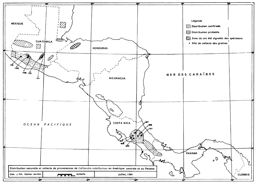 Les zones de collecte des graines couvrent pratiquement la totalité de l'aire naturelle de C. Calothyrsus en Amérique centrale. En 1984, on a recueilli des graines dans presque tous les peuplements connus, sauf au Panama où l'on espère faire une collecte en janvier prochain. Les graines ont été récoltées sur plus de 260 arbres représentant 11 provenances avec, pour chaque peuplement, un minimum de 20 arbres distribués aléatoirement (voir tableau 1 et carte).