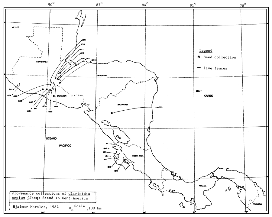 3. Conservation of seed sources. The provenances from natural stands in Costa Rica come from areas protected by government laws, while live fences, because of their value to the owners, are unlikely to be destroyed. In Guatemala the natural stands are located on state lands and their conservation can be ensured through coordination with the Servicio Forestal Nacional (National Forest Service).