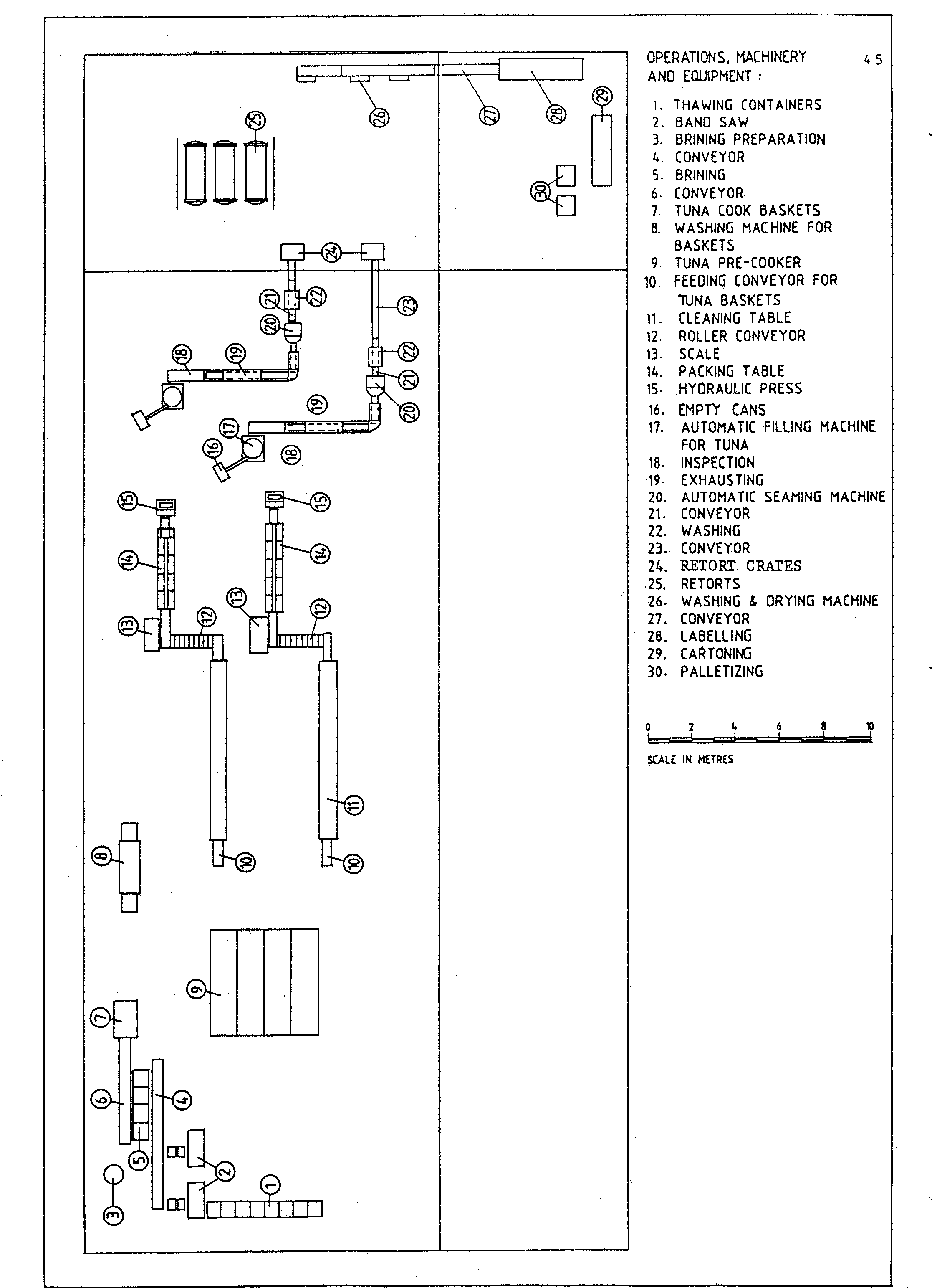 The description is related to canning plant with a capacity of 20 tons whole raw fish (bluefin or yellowfin tuna) per 8 hours. The overall yield is approximately 50-55% which gives approximately 10 000 450 g (1 pound) cans or 20 000 225 g (1/2 pound) cans per 8 hours. See Figure 4 "Layout for tuna cannery".