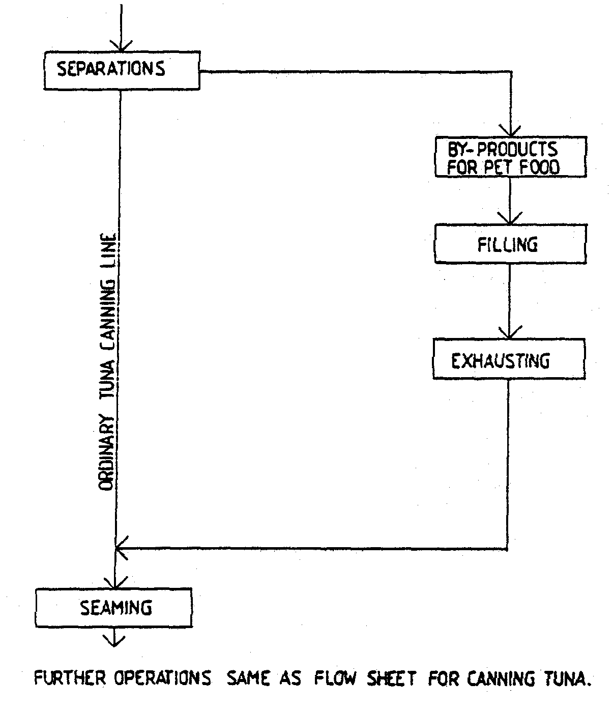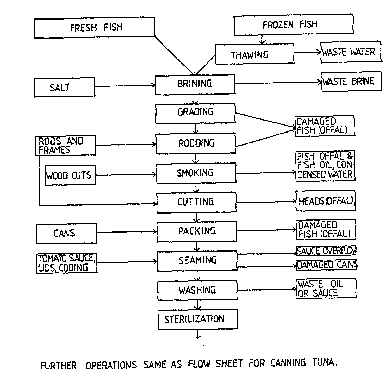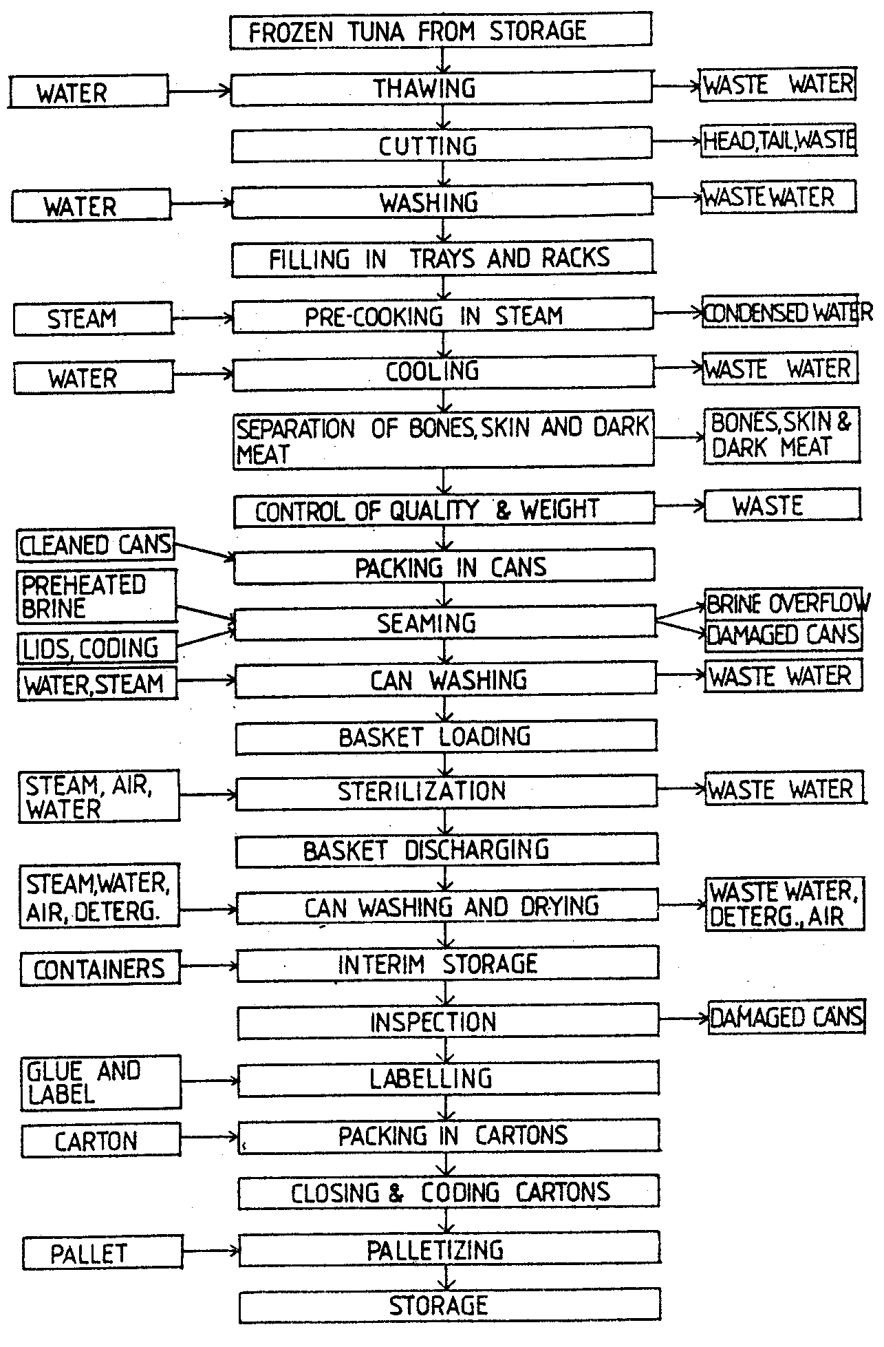 Simplified flow sheets for canning tuna in brine, tuna flakes with vegetables and tuna. pet food are shown in Figures 5, 6 and 7 respectively.