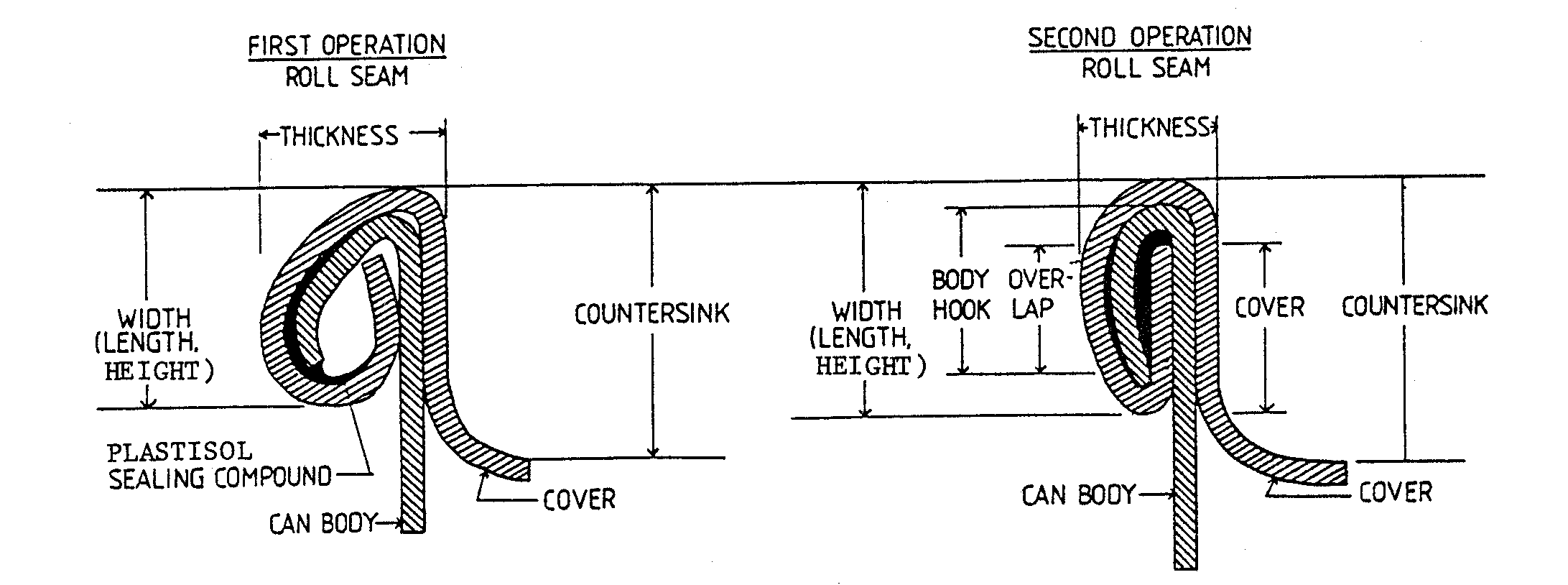 The sealing compound renders the seam air tight (hermetic). Around its circumference the double seam consists of five layers of metal -three layers of the can end and two layers of the can body, however at the intersection with the side seam there are seven layers of plate, the extra two being due to side seam overlap.
