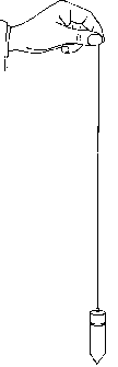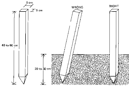 Pegs (see Fig. 8) are used when certain points on the field require more permanent marking. Pegs are generally made of wood; sometimes pieces of tree-branches, properly sharpened, are good enough. The size of the pegs (40 to 60 cm) depends on the type of survey work they are used for and the type of soil they have to be driven in. The pegs should be driven vertically into the soil and the top should be clearly visible.