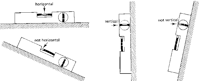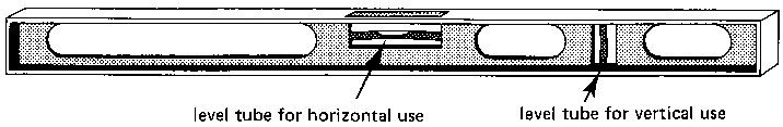 Each tube is sealed and partially filled with a liquid (water, oil or paraffin). The remaining space is air, visible as a bubble (see Fig. 6). On the glass tube there are two marks. Only when the carpenter level is horizontal (or vertical) is the air bubble exactly between these two marks (see Fig. 6).