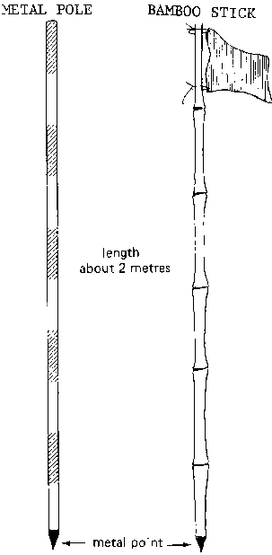 Ranging poles are straight round stalks, 3 to 4 cm thick and about 2 m long. They are made of wood or metal. Ranging poles can also be home made from strong straight bamboo or tree branches.