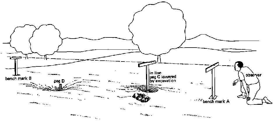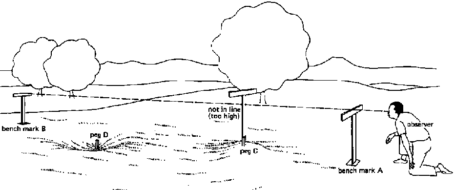 Place boning rods on top of the two Bench Marks and on top of peg C. The observer, looking just over the top of boning rod A tries to bring the tops of the boning rods A, B and C in line.