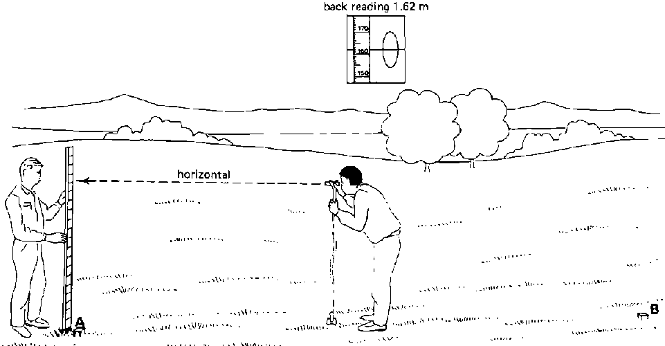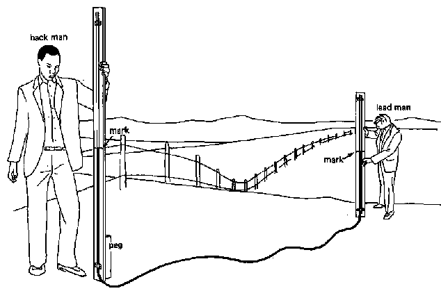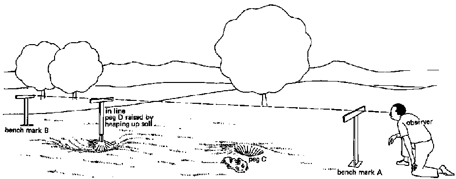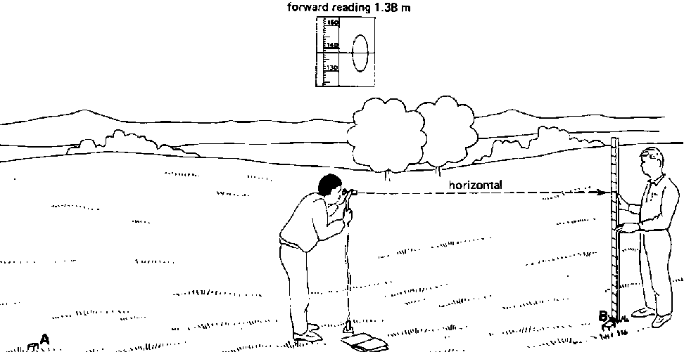 The point where the staff is then standing is at the same level as the starting point. A second peg (peg B) is placed at this point.