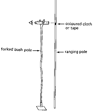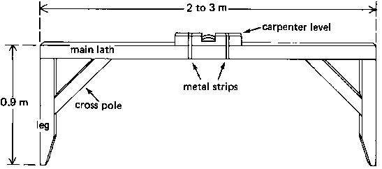 Surveying or survey levelling is practised to determine the differences in elevation (= vertical distances) between various points in the field, to measure distances (horizontal distances), to set out contour lines etc. Major surveying works are done by engineers or qualified surveyors using sophisticated equipment such as the levelling instrument (see Fig. 33). This Section will only deal with elementary equipment. Most equipment can be home-made and be used by the farmers themselves after little training.
