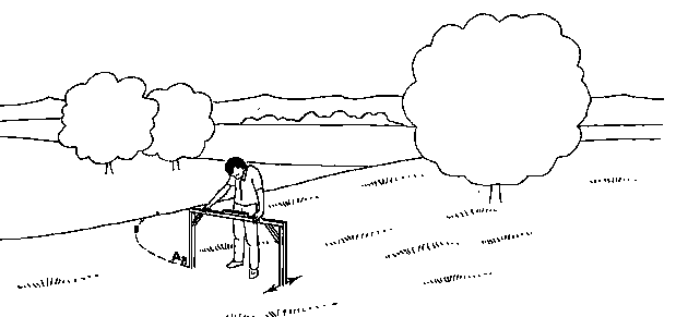 One leg of the instrument is placed close to peg (A). By turning the frame around this leg, a position of the frame is found such that the second leg is on the ground and the bubble of the carpenter level is in between the marks. This means that the spot thus found by the second leg of the frame is at the same elevation as the starting point. Both points belong to the same contour line. A new peg (peg B) is driven in close to the second leg to mark the place (see Fig. 37 a).