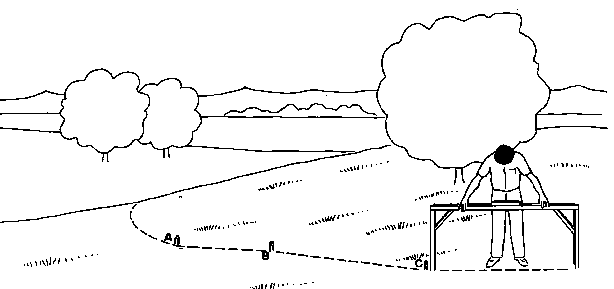 The observer takes a position about half way between the two points A and B, that are less than 25 m apart, Over this distance the hand level can be used with reasonable accuracy (see Fig. 50a).