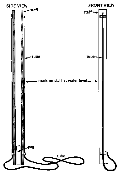 The two staffs are placed back to back at the starting point marked with peg (A). After the air bubbles have been removed and the water has come to a rest, a mark is made on both staffs, indicating the water level (see Fig 43a).