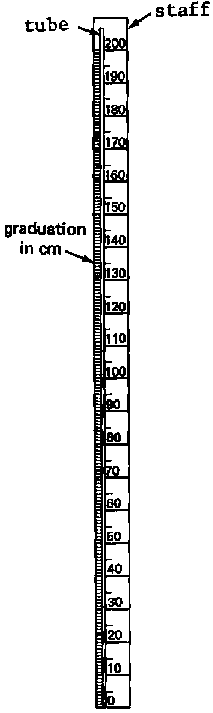 For the measurement of differences in elevation between two points in the field, the tube water level is adapted. Each staff is graduated in centimetres and used as a measuring staff. The zero point usually coincides with the foot of the staff (see Fig. 44).