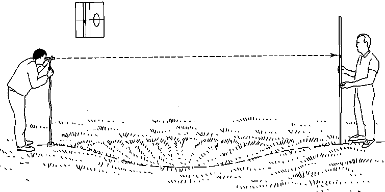 The assistant places the staff at point A. The observer sights the staff at point A and moves the instrument to the horizontal position. The value indicated by the horizontal hairline is read and written down by the observer (see Fig. 50b). This reading is called a back reading.
