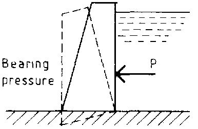 3 Bearing on Ground - The normal pressure between the base of the wall and the soil beneath can cause a bearing failure of the soil, if the ultimate bearing capacity is exceeded. Usually the allowable bearing pressure will be one-third of the ultimate value. Note that the pressure distribution across the base is not constant.