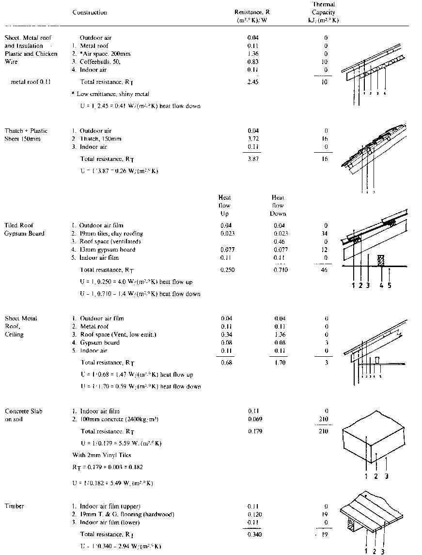Using values from Tables 7.1 and 7.2 overall heat transfer coefficients (U) have been calculated for a number of composite wall and roof constructions. Although estimates were necessary for some materials, the U values are realistic. Table 7.3 shows several of the construction units.