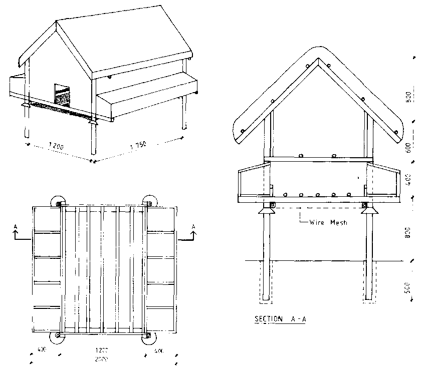 A small house of this type with slatted floor is shown in Figure 10.41. Alternatively wire mesh can be used for the floor. It is built on treated wooden piers 0.8 to 1m above the ground. Ventilation and manure removal are both facilitated, no litter is required and bird density can be 6 to 8 per m². Feeding, watering and egg gathering are all efficiently handled from the outside. Either a double pitch thatch roof or a single pitch corrugated steel roof may be installed with the eaves about 1.5m above the floor. If the latter is used, some insulation under the roof is desirable. The feed troughs should be equipped with hinged covers and rat guards should be installed at the top of each pier. The width of this type of building should be limited to about 2m to allow easy removal of manure and adequate wall space for feed and nests. The building should be oriented east and west and may be of any length. However, if it is more than 5m long, nests will need to be put on the sides and all remaining wall space on either side used for feeders in order to allow the required 100mm/bird. See Table 10.13.