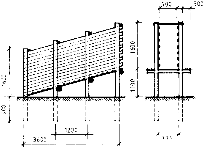 A loading ramp is necessary to load stock into lorries for transport to market or transfer to other grazing areas. Figure 13.23 shows typical dimensions for a cattle loading ramp. Note that the ramp floor has cross battens every 20cm to prevent slipping. The catwalk along the outside is convenient for workers who are urging the animals along. A height of 1. 1 m is a little low for articulated lorries and a little high for most two-axle lorries. However, it should be adequate for either. A ramp slope of approximately 30cm/m is suggested.