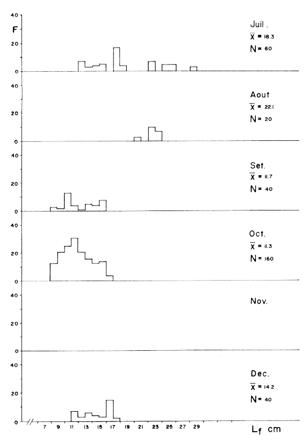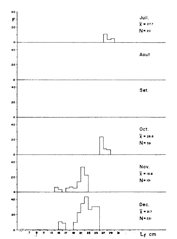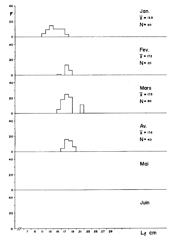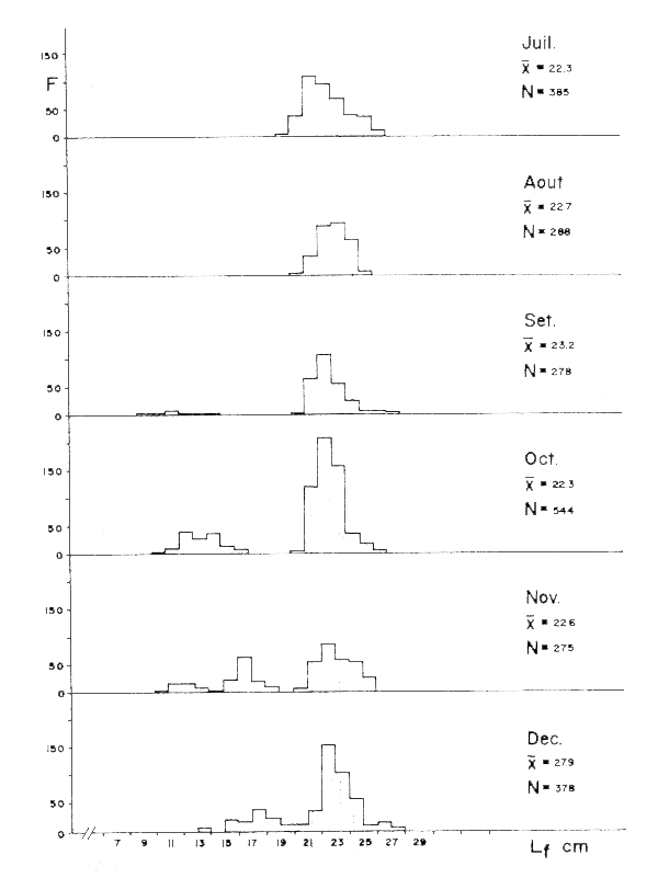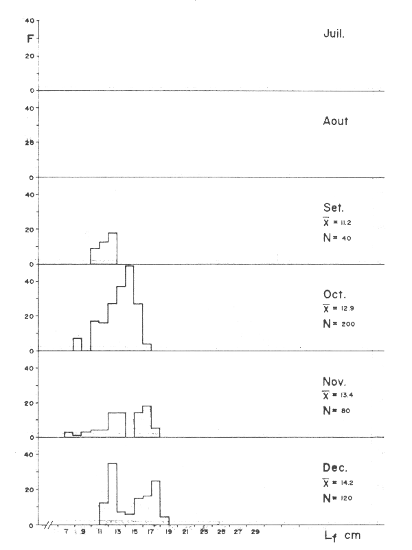 Les données de taille/fréquence pour cette espèce sont présentées dans la figure 3. C'est une espèce qui se reproduit pendant toute l'année et qui se déplace le long des côtes selon les variations de température (FAO, 1978). C'est pour cette raison que l'on peut trouver de petits exemplaires pendant toute l'année et dès lors il devient difficile d'établir un critère sur l'époque de recrutement.