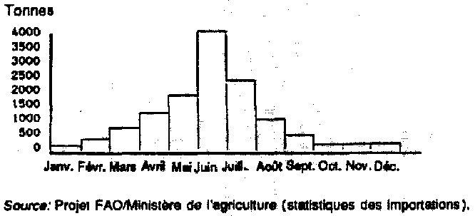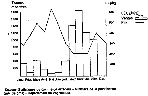 Offre: Il existe parfois des statistiques de l'offre mensuelle des divers produits sur le marché. Ces chiffres permettent d'établir des graphiques qui font apparaître les moments où l'offre diminue. Ainsi, le graphique 3 (voir Graphique 3.Importations mensueIIes de mangues dans les Emirats arabes unis (1985)) indique que le marché des Emirats arabes unis est peu approvisionné en mangues d'octobre à mars.