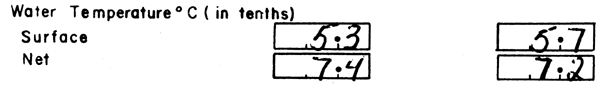 3.   When available, record surface water temperature and water temperature at the net for the start and end of the tow. Net temperature is usually only available when a headline transducer (transmitter of the head rope) is in use (most often on midwater and off-bottom gear). In recording recording surface temperature, make certain that the reading is not artificially high (or low) due to the thermometer being too close to the outlet for the vessel's engine coolant. All temperatures are recorded in degrees Celsius (C°.)