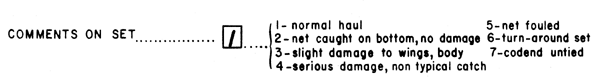 Unlike card type 2, the observer alone is responsible for the accuracy of the data on this sheet. The crew may be of some use in providing information such as positions and depths, but the observer must always double check to make sure the data satisfies the conditions specified on Card Type 3. Experience has shown that both foreign and domestic crews often confuse the actual time and position of the beginning of a set with the time and position the net reaches its fishing depth, the actual information needed for Card Type 3. The unwary observer who depends entirely upon mates or helmsmen for such information often will have an entire data set filled with inaccuracies. It is not sufficient to be convinced that the crew know the type of information needed. The observer must check for himself at least periodically and then double check it.