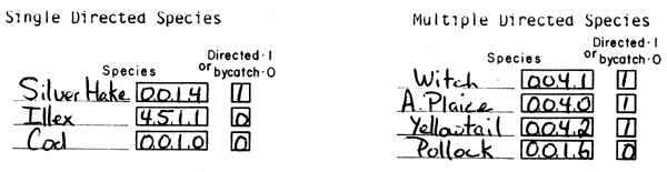 2.   Indicate whether the species is being directed for, or is a by-catch. Directed species is the main species sought, rather than the main species caught. Consider the area being fished, known habits of the species being sought and factors such as bottom type and depth when in doubt about what is actually the directed species, especially in cases where the master is reluctant to disclose such information. It is possible to have more than one directed species. For example many fishermen will state that they wish to catch “flounder” without regard to whether the flounder caught is Witch, Yellowtail, or American Plaice. In such cases record each species as directed.
