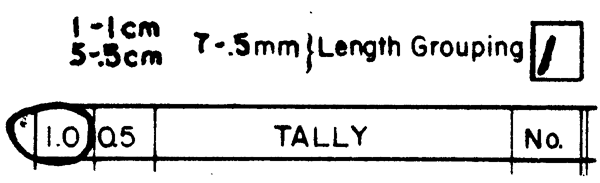5.   Enter the length grouping and circle the appropriate column on the tally sheet portion of the card type. This step is extremely important. Most fish species are measured to the nearest centimetre, so if fish are being sampled enter 1 for the field “Length Grouping” and circle the 1.0 column.