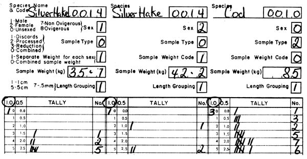 Note: In the above example the silver hake sample (first two columns) was in all probability taken from the vessel's main bunker, while the cod sample (third column) was taken from the baskets used to hold the fish as it was sorted out.