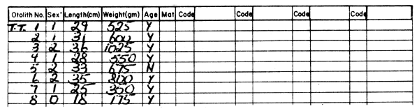2.   It is desirable to have otoliths taken for each fish studied for age and maturity. However, this may not always be possible, so it is necessary to indicate Y (Yes) or N (No) in the “AGE” column to indicate whether or not otoliths have been successfully taken. If an observer is so unfortunate as to lose the otoliths after the sample, any Y's should be changed to “N”, so the remaining information can still be used.