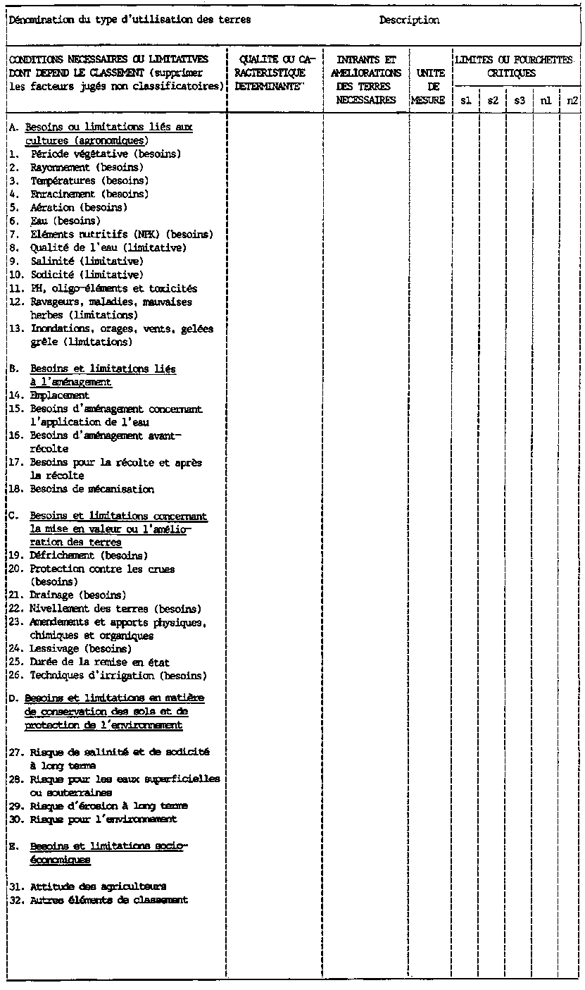Etape 5: Quantifier les limites critiques correspondant à chacun des niveaux daptitude s1, s2, s3, n1 et n2 des besoins et limitations des différents types dutilisation des terres. Ces limites constituent les spécifications de chaque facteur considéré du point de vue des besoins et limitations du TUT. Celles-ci peuvent être représentées par des qualités appropriées de terres ou par des caractéristiques représentatives, auxquelles sajoutent les intrants et améliorations qui influent sur lindice de productivité, le revenu agricole net ou lavantage net supplémentaire tiré de lirrigation. Inscrire les limites critiques sur le formulaire 1 pour représenter séparément le niveau daptitude de chaque facteur.