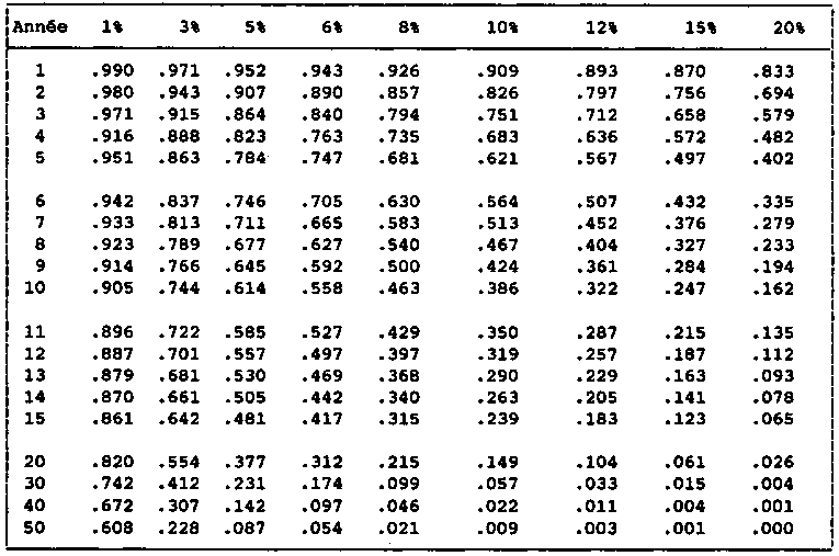 Pour obtenir le versement annuel uniforme à effectuer pour amortir 1 000 dollars en vingt ans à un taux dintérêt de 10 pour cent, on divise 1 000 par le coefficient 8,51. Le versement périodique à effectuer est de 117,51 dollars.