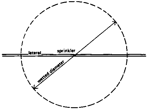 The wetting pattern from a single rotary sprinkler is not very uniform (Figure 57). Normally the area wetted is circular (see topview). The heaviest wetting is close to the sprinkler (see sideview). For good uniformity several sprinklers must be operated close together so that their patterns overlap (Figure 58). For good uniformity the overlap should be at least 65% of the wetted diameter. This determines the maximum spacing between sprinklers.
