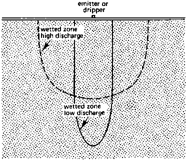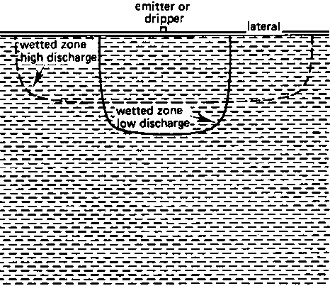 Unlike surface and sprinkler irrigation, drip irrigation only wets part of the soil root zone. This may be as, low as 30% of the volume of soil wetted by the other methods. The wetting patterns which develop from dripping water onto the soil depend on discharge and soil type. Figure 64 shows the effect of changes in discharge on two different soil types, namely sand and clay.
