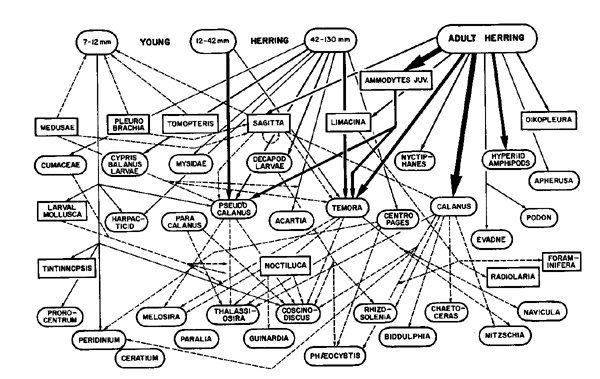Figure 1 Hardy's herring feeding diagram. An early diagrammatic representation of the feeding relationship in the North Sea plankton. As used by Hardy (1924), the arrows point from the predator to the prey, implying a controlling influence of predators on prey biomass. This may not always be true, and recently the trend has been toward showing the flow of materials from the planktonic organisms to the herring biomass, and vice versa for some pelagic predators on larval herring: (thickness of arrows being roughly related to the degree of influence on the prey, or (in the opposite sense), to the proportion formed by each prey in the diet of the predator, herring)