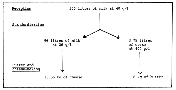 This represents a theoreticval breakdown - i. e. showing, in theory, the amount per product after milk processing. This, of course, needs to be compared with the amounts actually produced. If there is too great a difference, one must then proceed to ascertain just where the discrepancy lies; whether in the measurement of the volume of milk received, the determination of fat content, or in the quantities of milk and cream after standardization, etc.