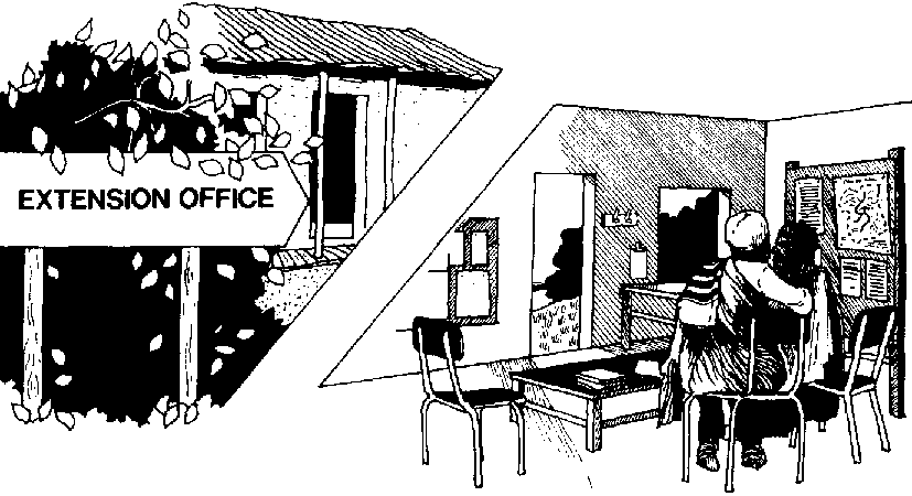 For some farmers, a visit to the extension office may be a difficult experience. The agent should, therefore, try to put the farmer at ease, asking a few questions in order to get the farmer to explain his problems. The agent should be polite but purposeful, and try to find out the reason for the visit as quickly as possible. When he feels that the matter has been adequuately discussed, the agent should tactfully terminate the interview in order not to let it drift aimlessly on. The agent should always escort the visitor out, and say goodbye. A note on these office visits should also be added to the farmer's record card, and any follow-up implemented.