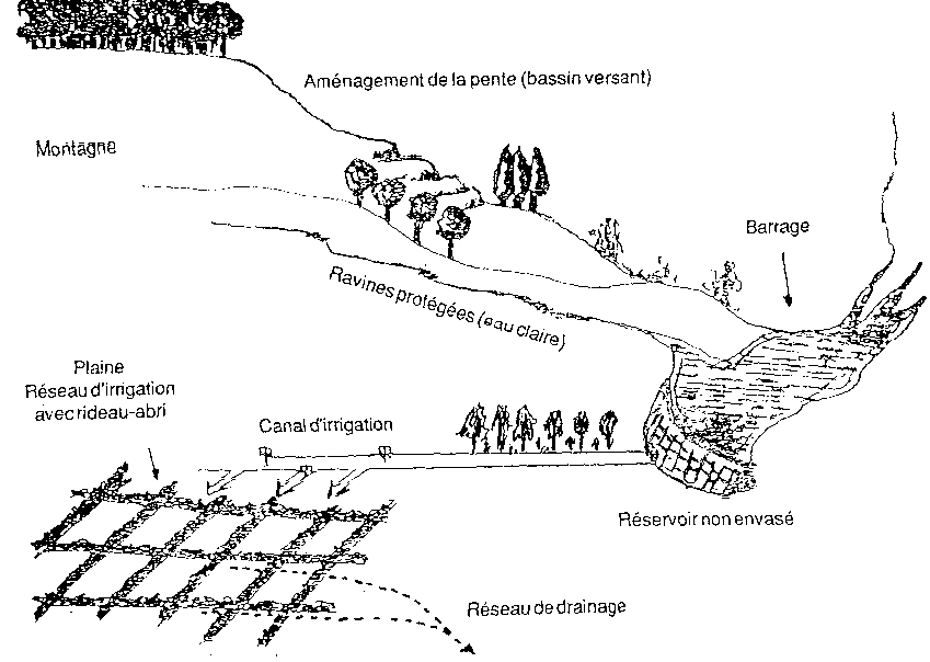 - Erosion hydrique - L'érosion hydrique est un phénomène important dans la plupart des zones arides. Ce type d'érosion résulte de la susceptibilité du sol aux fortes intensités de précipitation et de la fréquente destruction du couvert végétal. Lorsque ces conditions sont réunies, des quantités considérables de terre sont emportées par ruissellement dans les zones de captage des eaux. Les routes sont endommagées, les bas-fonds sont inondés et les ruisseaux et oueds sont remplis d'eau boueuse. Une partie de cette eau chargée de sédiments s'accumule dans des réservoirs ou est transportée vers les lacs ou la mer. La déperdition d'eau par ruissellement et l'érosion consécutive du sol peuvent être maîtrisés par des mesures préventives de conservation du sol. Le rôle de la végétation dans la réduction de l'envasement des barrages, la régulation de l'écoulement des cours d'eau et la prévention des inondations et de l'érosion des sols peut être inestimable (Figure 2.5).