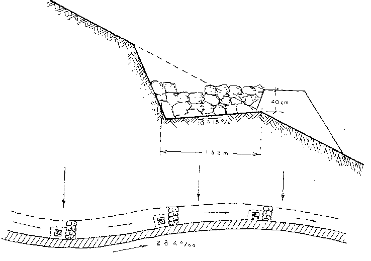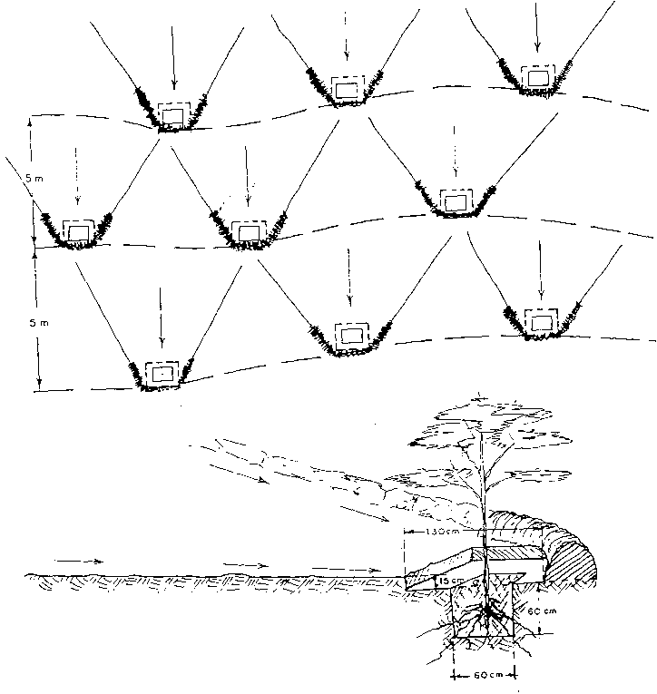 Les techniques de tranchées de niveau sont utilisées en terrain accidenté. Les tranchées peuvent être continues (Figure 4.4), divisées par des banquettes transversales ou être courtes et discontinues (Figure 4.5), disposées de façon que les intervalles entre les tranchées dans une rangée soient en face de ceux de la rangée suivante; dans ce dernier cas, le ruissellement de la pluie est capté. Les tranchées sont formées manuellement ou mécaniquement. Sur un terrain en pente douce, on peut utiliser la technique en arête de poisson (Figure 4.6).