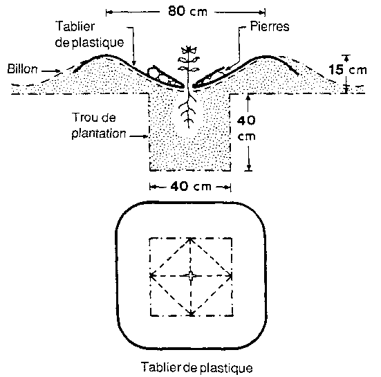 Une bonne méthode de préparation des trous de plantation consiste à entourer le trou d'un petit billon (de 15 à 20 centimètres de haut), afin de créer une petite cuvette (d'environ 80 centimètres de diamètre); c'est particulièrement utile lorsque les plants sont arrosés individuellement après la plantation. La petite cuvette ainsi préparée peut aussi être recouverte d'une feuille de plastique (maintenue en place sur le sol avec des pierres ou de la terre), avec une ouverture au centre pour le plant, comme on le voit à la Figure 4.8. La feuille de plastique empêche l'évaporation de l'eau de la terre du trou de plantation. D'autre part, la rosée se dépose sur sa surface et coule vers l'ouverture centrale de la feuille de plastique pour irriguer les racines. En conservant l'humidité du sol, les films plastiques facilitent l'installation et la croissance des arbres et arbustes au cours des premières années les plus critiques. Un autre avantage des films plastiques opaques est qu'ils empêchent la croissance des mauvaises herbes en réduisant la pénétration de la lumière. Avec la suppression des mauvaises herbes au voisinage immédiat des plants, on peut également économiser de la main-d'oeuvre.
