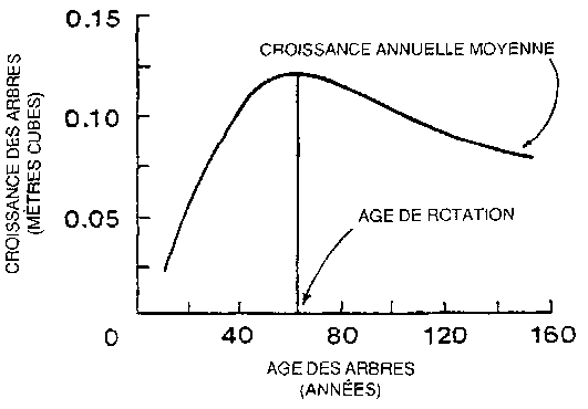 Figure 4.11 Rapport entre l'âge des arbres et leur croissance indiquant l'âge de rotation.