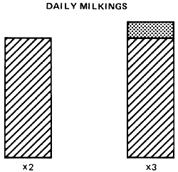 MILKING FREQUENCY affects total daily production. Milking three times instead of twice daily will raise milk yields by an average 10%–15% but up to 10% of this increase will be required to cover extra costs. Chemical composition of milk is unaffected.