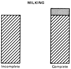 There are two forms of incomplete milking. One is that excessive amounts of residual milk are retained in the udder because of inadequate milk ejection stimuli or the inhibitory effects of adrenalin secreted by cows becoming frightened and upset during milking, or even by slow milk removal. The other form is that some of the available milk is left in the udder when milking ceases, ie., the so-called ‘strippings’. The modern milking machine is designed to remove 95% of available milk without recourse to additional cluster weight or manual assistance. Hand stripping, particularly with the finger and thumb should be avoided. The amounts of strippings are likely to be small even in relation to normal levels of residual milk and if not removed are unlikely to affect significantly either the lactation yield or quality of milk.