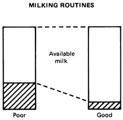 MILKING ROUTINES are a reflection of good stockmanship. Cows are creatures of habit; avoid any circumstances which upset or frighten them and so inhibit milk ejection.