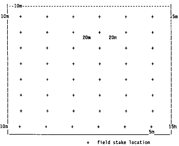 Surveying and mapping the field involves setting a uniform grid system on the field and establishing the field topography. This need not be a complicated procedure. One corner of the field can be chosen as a starting point and the first stake can be located one-half grid spacing from either boundary. Then a row of stakes can be measured and set using a transit or level and tape. The instrument is set up over the first stake and sighted along a line parallel to the boundary. Usually this is accomplished by going to the opposite edge and locating a stake one-half grid spacing from the edge. Then, using the instrument for alignment, the first row of stakes is measured into place. With the instrument located over the same stake and aligned along the first row, the next step is to turn the alignment 90° by either measuring a right triangle or by using the instrument angle indicators if available. The new alignment is used to locate another stake row along the other field axis. Each of the remaining stakes can be placed visually by sighting against the two stakes at the field edges. The grid spacing can be set at convenient lengths so long as it is square and consistent (this is not technically required but it simplifies the calculations). In the US, the typical grid spacing is 100 feet by 100 feet (30.5 m by 30.5 m). However this would be too large in many countries with small fields. It is suggested that the surveyor use a multiple of 10 m as a spacing and select one that divides the field into at least 5 percent subareas.